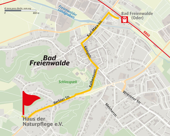 Vom Bahnhof Bad Freienwalde zum Haus der Naturpflege sind es etwa 30 Minuten zu Fuß.