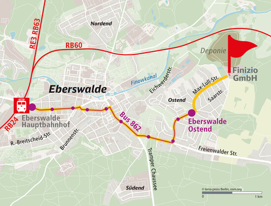 Die Buslinie 862 fährt bis Eberswalde Ostend. Von der Haltestelle sind es noch circa 15 Minuten zu Fuß. Der Weg führt über die Max-Lull-Straße und den Hangweg.