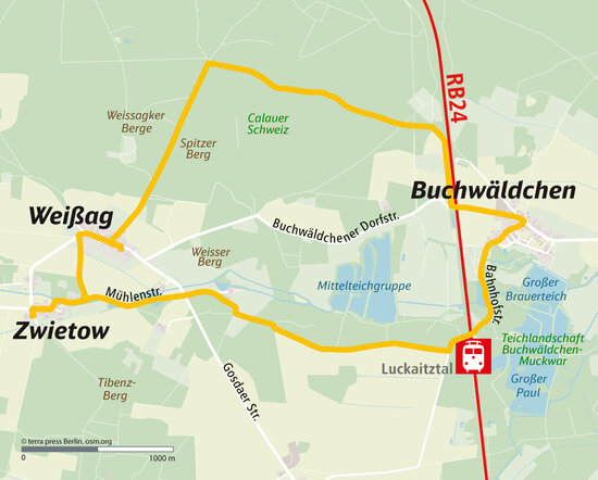 Der Bahnhaltepunkt Luckaitztal liegt mitten im Wald. Der Wanderweg ist von hier mit einem gelben Punkt ausgeschildert. Es geht auf dem Bahnhofsweg Richtung Nordosten, vorbei an einem Teich, in den Ort Buchwäldchen. Linker Hand führt die Buchwäldchener Dorfstraße Richtung Bahngleise. Hinter der Unterführung beginnt rechter Hand ein Feldweg parallel zu den Schienen, der dann nach links abzweigt. Bald ist der Aussichtsturm mit seinen 216 Treppenstufen erreicht. Dem gelben Punkt in südlicher Richtung folgend, gelangt man in das Plinsdorf Weißag. Am westlichen Ortsrand geht es links auf dem Wiesenweg nach Zwietow und von dort zurück zum Haltepunkt Luckaitztal.Entlang der Mühlenstraße in Zwietow sowie auf dem Bahnhofsweg Richtung Buchwäldchen gibt es über jeweils rund einen Kilometer keinen Fußweg. Beide Straßen sind wenig befahren und bieten Platz zum Ausweichen, sollte ein Fahrzeug kommen.